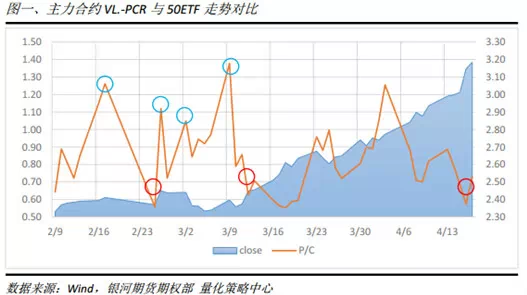 在图一中我们提供了自2月9日期权上市以来,主力合约VL.-PCR和上证50ETF的走势对比。由于期权市场的交易量过半在主力合约,更加能反应市场的情绪和观点,所以这里我们把重点放在主力合约上。从图一中可以看出,蓝圈标示的地方为VL.-PCR的高位,红圈标示的地方为VL.-PCR的低位。当VL.-PCR位于低位时,第二天较大概率出现了标的物价格的上涨,而当VL.-PCR位于高位时,标的物价格较大概率出现了持平或者下跌。