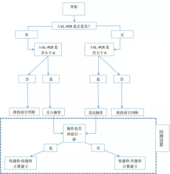 计算出当日的ΔVL.-PCR,判断其正负。若是正值,且大于X,则出给卖出信号;若是负值,且小于-X,则给出买入信号;若没有给出信号,则维持之前的判断。