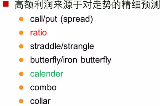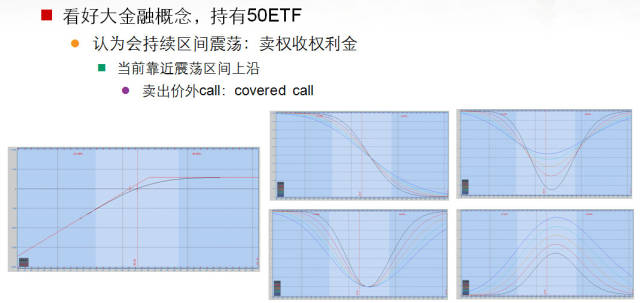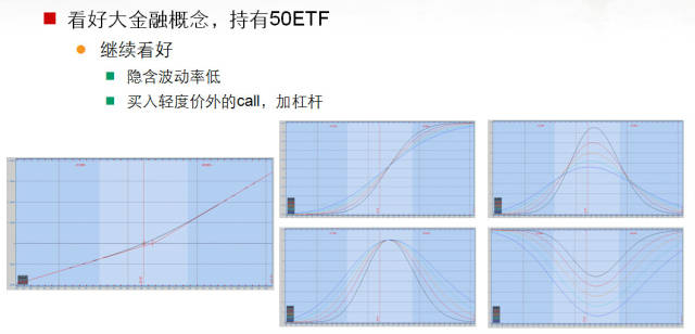 第一,收益增强,一大原则是牛市不需要套保,我个人觉得上证50ETF还是会有一波行情,而第一个原则就是在牛市里面不需要套保。如果看好大金融概念,持有50ETF,得分多种情况考虑:如果隐含波动率比较高,适合卖出轻度价外的Put,靠收权利金赚钱。这五张图分别为到期和当期损益,delta、gamma、vega和theta。但有时候call的隐含波动率比较低,有一阵子call的价格压得很低,就算是将隐含波动率调到零,算出来的理论价格依然高于市场价格,那么像这样的一种情况的话,就适合买轻度价外的call。