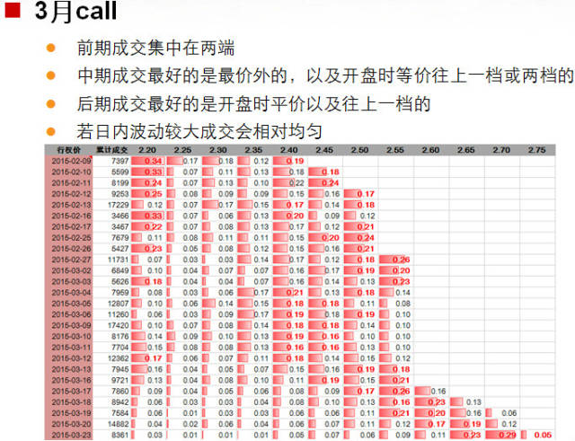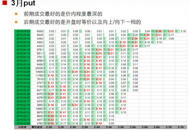 另外就是Put,Put和Call比起来就比较简单,它前期成交最好的是价内程度最深的,后期成交最好的是开盘时等价以及向上、向下一档。总的来说,从期权上市到现在,因为标的走的是单边的行情,总体来说比较好赚钱。如果单纯买一个Call或者是卖Put,实际上钱赚得比较爽的。