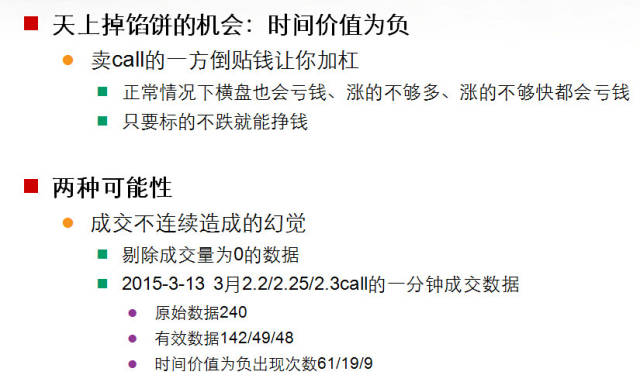 之前的期权市场出现了一些让人匪夷所思的情况。第一个就是海外绝对不会出现的时间价值为负的情况,也就是期权卖出的价格低于它的内在价值,在正常情况下,如果指数横盘了一段时间,因为有一个期权价值的时间流逝,其实是会亏钱,如果是买了价外期权,如果到期的时候涨的不够多,那时候期权价值就直接归零,变成废纸。另外涨得不够快也容易亏钱,因为delta带来的上涨弥补不了theta带来的亏损。但如果期权时间价值为负,只要标的价格不下跌就不会亏钱,简直是too