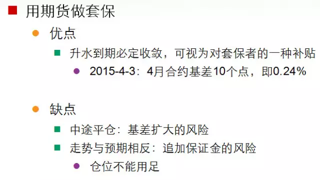 第二,用期权做风险规避。先说用期货来做套保。比如说我写PPT的时候是4月3日,那时候就4月IF合约基差10个点,即0.24%,如果通过空IF来套保可以多拿0.24%的alpha。缺点是如果中途平仓会面临基差扩大的风险,这时候会被迫追加保证金,如果前期的保证金留的太足,整体收益会削弱,如果保证金不足的话,就会被迫平掉现货头寸来追加期货的保证金。现在的现货和期货的头寸不能合并结算,所以会有这种麻烦。