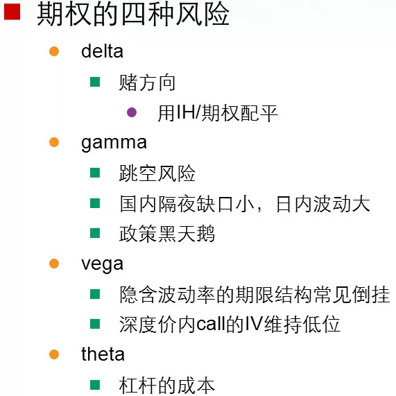 接下来说一些期权的四种风险,其实我们这里说的任何一项都既是风险又是收益的来源。第一种是Delta,实际上是赌方向,可以用IH或者是期权配平。第二种是gamma,对应的是跳空风险,对国内市场因为隔夜跳空不大,而日内波动较大,所以正常情况下gamma的风险比较小,所以不太需要关心。但等到大指数见顶的时候,