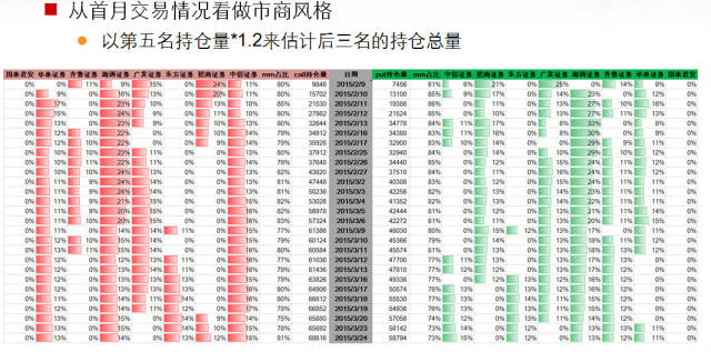 这一张是持仓量的图,两张图放在一起比较可以对做市商的风格有一个判断:像招商东方成交大但持仓小的,也就是来炒短线的;像齐鲁、华泰是成交小但持仓大的,也就是做价值投资的。像中信、广发、海通持仓量大持仓也大,就是既能做短期也能做价值投资,比较牛的。但是这个报告完稿的时候似乎委屈了国泰君安,当时认为它成交小持仓也小,但是据说盈利状况不错,而现在成交量似乎已经上去了。
