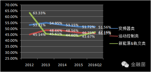 https://xqimg.imedao.com/157379154d0b963fbfef239f.png!custom.jpg 查看原图https://xqimg.imedao.com/1573791758fc033fdd5bccc4.png!custom.jpg查看原图而查看公司的营收分项可发现,造成整体毛利率下滑的一个主要原因,是近年来相对低毛率的新能源&轨交类收入在飞速提升。公司从2011年即开始涉足新能源领域,而随着近年来新能源客车的不断放量,公司的这部分的收入取得了飞速的发展,可以看到,自2012年开展以来到去年为止,这部分营收已经增长了整整33倍!近四年来的增速最低也在100%左右。而这部分产品的毛利率一直以来都是低于变频类业务和运动控制类业务的,因而导致整体毛利率略有下降;在今年Q2,这部分收入的毛利率已经超过了控制类业务,可谓是量价齐升,预计新能源业务将是公司最近一两年来最重要的业绩增长点。