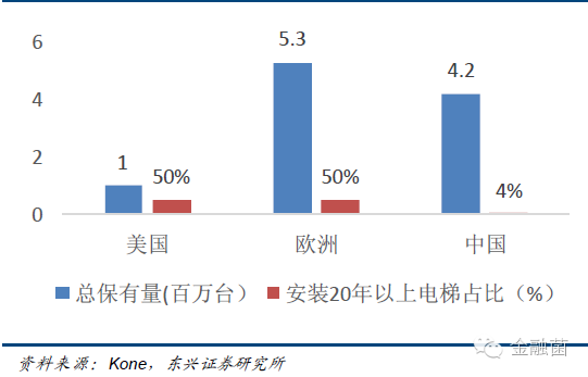 一是国内安装20年以上的电梯占比目前极低,仅为4%,远不及欧洲和美国的50%;未来旧电梯维保及旧电梯更换将释放出巨大的空间,从而有效补充新增房地产投资的不足。