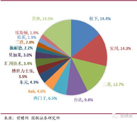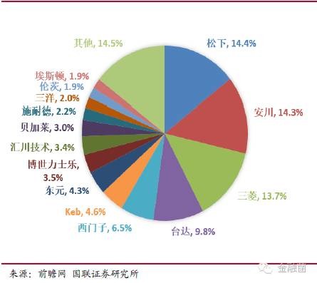 https://xqimg.imedao.com/1573796d9ecc0c3fd50a9e49.jpg!custom.jpg 查看原图我国目前的伺服市场仍分为日系、欧美系、台湾系、国产品牌等多个阵营。其中,以安川、松下、三菱为代表的日系品牌市场份额达40%以上,以西门子,博世,施耐德为代表的欧美系品牌市场份额近年来下降较快,目前占比在12%左右,以台达、东元为代表的台湾品牌市场份额约为14%,而其中公司的市场份额为3.4%,排名第9。