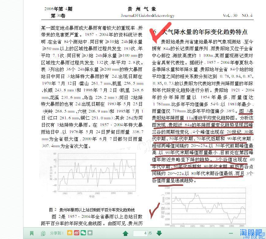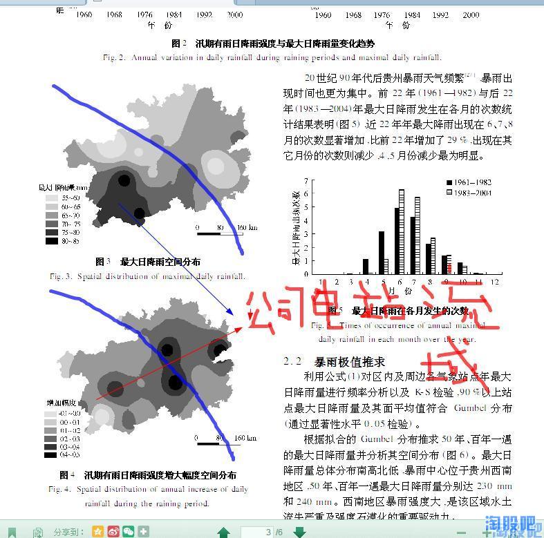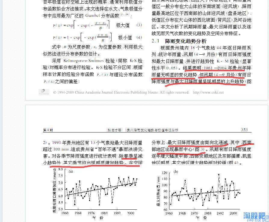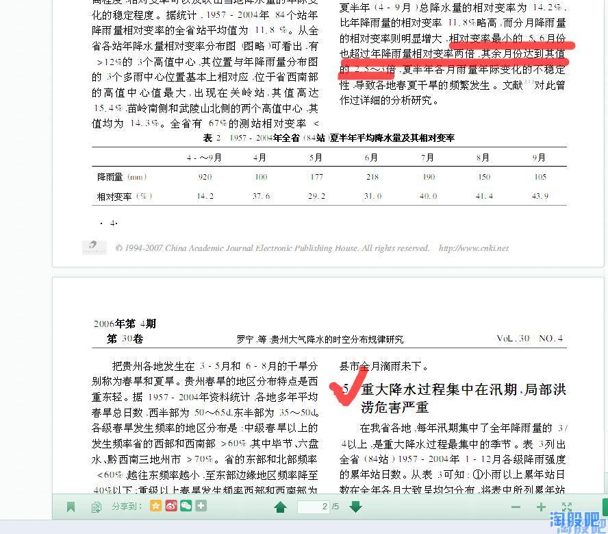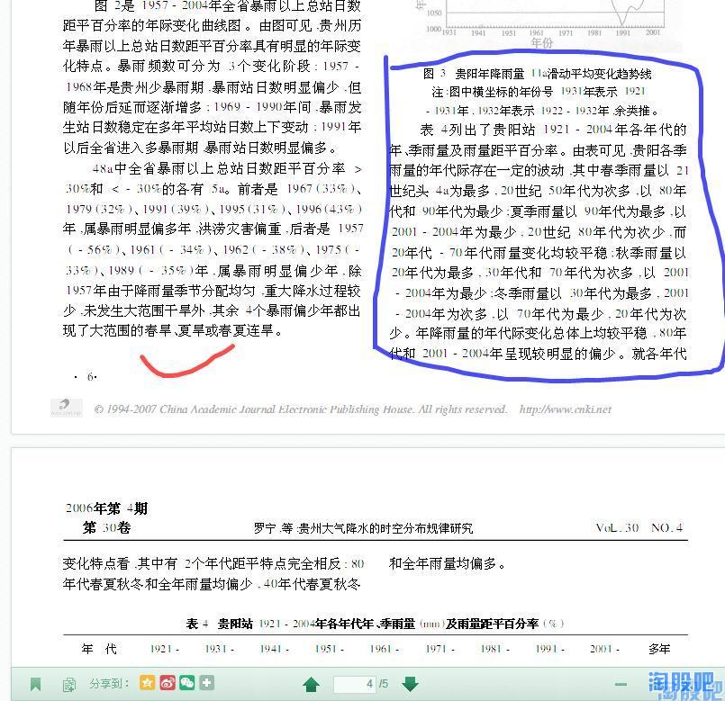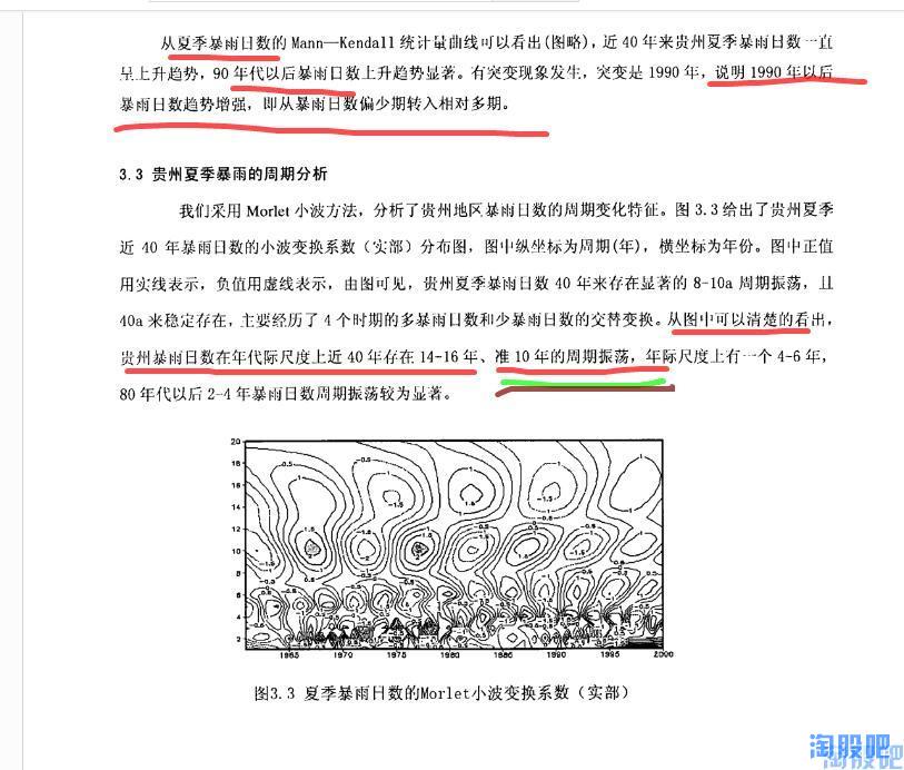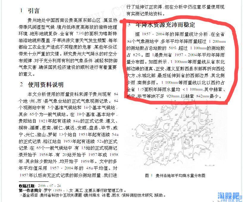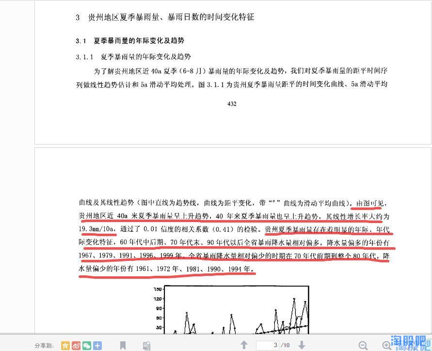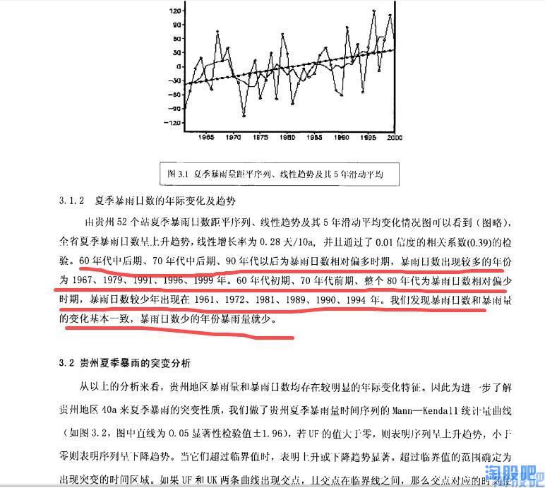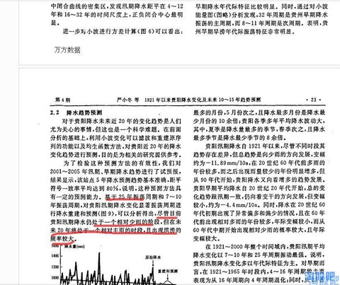 那,是什么原因导致了黔源电力近几年的发电量大幅低于历史平均值呢?难道真的像有些朋友说的那样是环境恶化导致的?随着时间的推移贵州地区降水会越来越少?一切结论都应以事实的科学的数据为依据,于是我带着这些问题试图探索贵州气象数据的变化规律,但这需要十分专业的知识并根据贵州气象志进行大量的数据分析,幸运的是已经有人走在了前面,使我们通过几篇学术论文就可以发现其变化规律。通过对贵州历史气象数据的分析,我们发现贵州降水,尤其是夏季降水成典型的10a左右的周期变化,即降水由峰值转向谷值约10-12年,由谷值转向峰值约10-12年,而黔源电力上市的10年,恰恰正处于贵州的降水由峰值转向谷值的十年,这正是黔源电力近年来,发电始终低于预期的原因!而现在,最坏的时期已经过去了,未来的十年,贵州将迎来一个降水相对颇丰的十年。摘取部分资料如下: