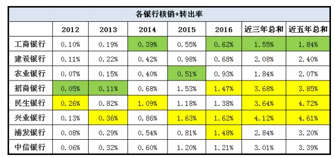 我们再来看一下各银行的核销力度,我们用“(核销+转出)/年初贷款余额”这个指标来看。