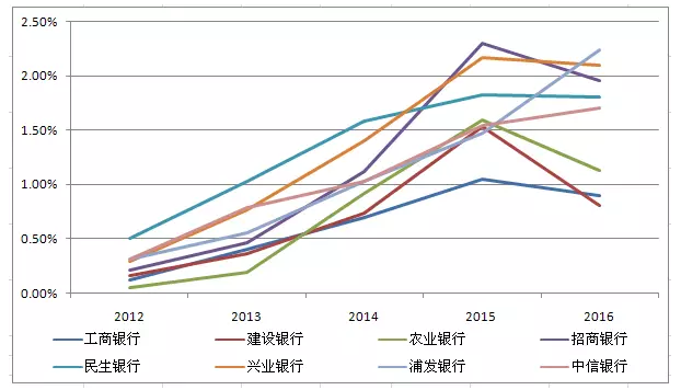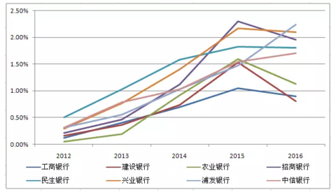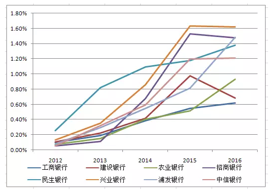 5、最近五年不良生成率前三位为民生、兴业和招商。民生银行的不良资产经过提前消化后,2016年的不良生成率的排名已经退出前三名。