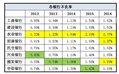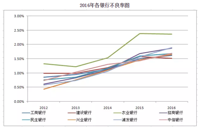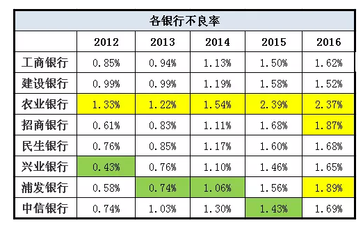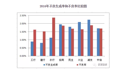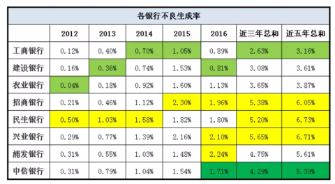 4、2016年数据显示民生银行和中信银行的不良生成率和不良率在股份制银行中并不算高,已经比招商、兴业、浦发都要低。