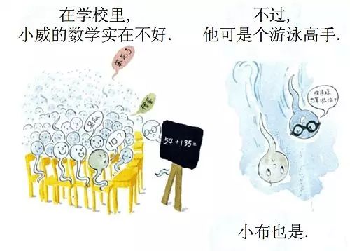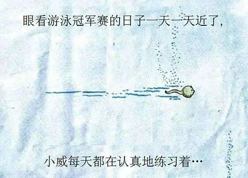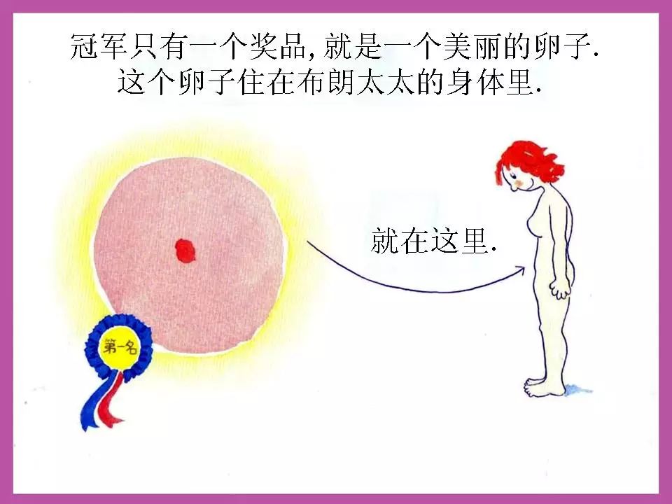 《小威向前冲》是一本绘本。书里图文并茂写了这样一个故事。小威是一个小精子,他和其他的精子朋友们一起住在布朗先生的身体里。游泳大赛的日子一天天近了,为了得到唯一一个奖品------布朗太太身体里的卵子,小威每天努力地练习。终于到了比赛的那天,布朗先生和布朗太太亲密地在一起,小威和其他小精子飞快地冲出起跑线。小威拼命地向前游,终于得到了那枚美丽的卵子,然后,奇妙的事情就发生了。小威不见了,布朗太太的肚子越来越大……