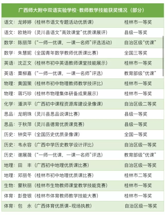 师资队伍质量的高低,是学校教育教学质量的根本保证,也是提升学生培养质量的决定性因素。广西师大附中双语实验学校的师资力量由广西师大附中统一调配和管理,自办学以来,以先进的教学理念为指导,严抓教学常规,带领全校教师探索“高效课堂”的教学模式。多次邀请桂林市教科所教研员到学校听课、展开教学研讨,也得到广西师大附中教学督导组的大力支持。