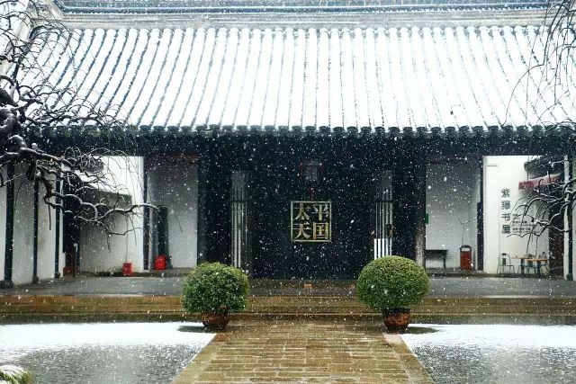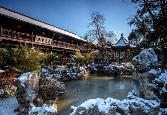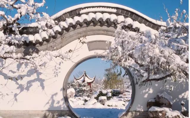白墙,黛瓦,飞檐,翘角。一层薄薄的白雪,让园林更富诗意。一眼望去,静谧安详。