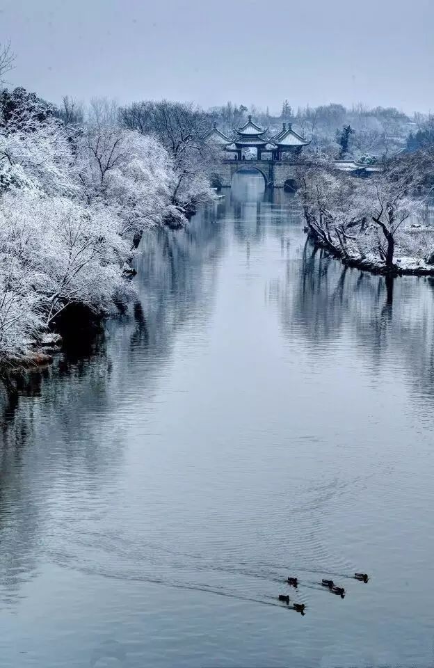 瘦西湖落雪了,推窗远眺,花影飞雪。莲花桥也悄然白了头,只有那几只略感寒意的鸭,还执意划破这一面柔水的镜子,独赏寒江雪。