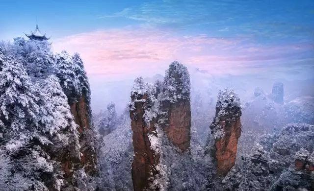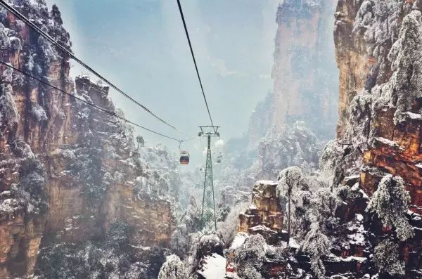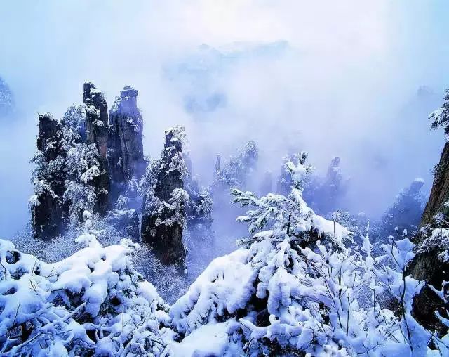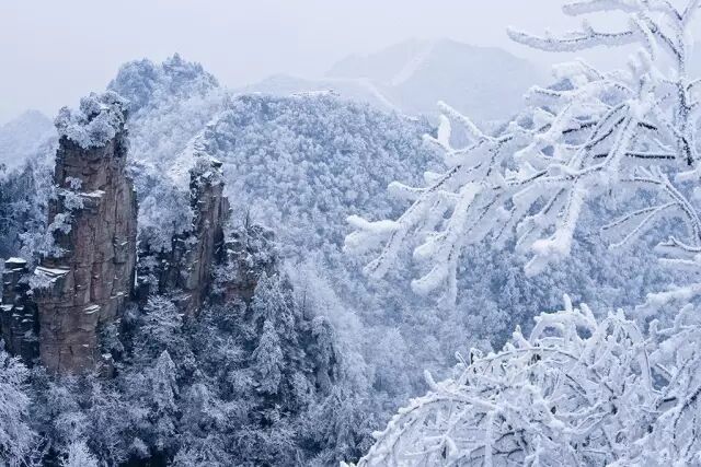 张家界属于典型的喀斯特地貌,冬季的雾雪天气给千姿百态的石峰林和拔地而起的石柱节理平添了几分神秘,也更凸显出它那独有的无穷魅力。