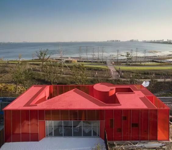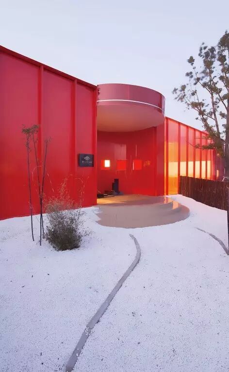 某售楼处厌倦了建筑界一惯的性冷淡外立面调性设计师大胆地用红色包裹了这一临时售楼处提出了关于建筑的一种可能性预言