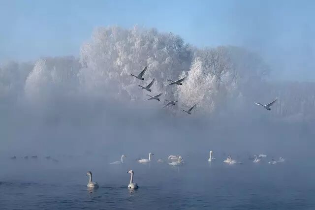可是湖里却冒着热气,野鸭游曳......