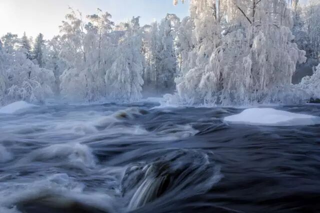 涛涛奔流的江水,岸边站立着雾凇奇景