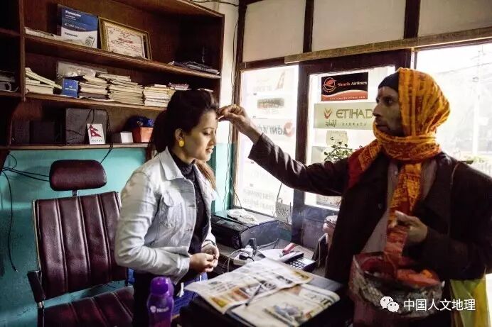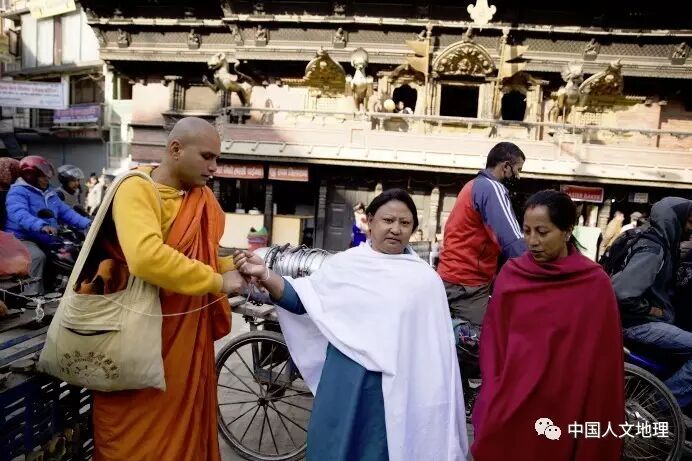 去过尼泊尔的人都知道,这个国家不论男女,额头上都会看到一个大大的“红痣”,虽然还不清楚这个红痣的具体寓意,但肯定是吉祥的象征,有福的象征。在尼泊尔,我们就遇到了为普通百姓送“福”的“送福之人”。