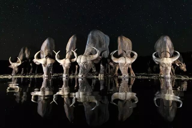 星空下的水牛。一头海角水牛来到水坑,在Zimanga私人野生动物保护区,在南非夸祖鲁纳塔尔。 Andreas