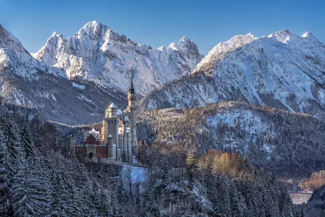 冬季童话。巴伐利亚阿尔卑斯山一个非常寒冷且清澈的冬日早晨,新天鹅堡城堡覆盖着新鲜的雪,使景观看起来像一个童话。Achim