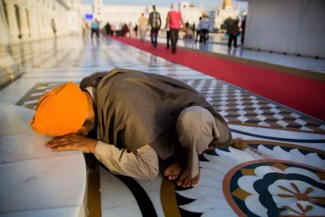 摄影师用盲拍的手法,低角度拍摄锡克教信徒参拜胜地的场