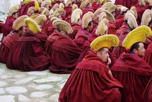 甘南拉卜楞寺里的僧人聚集在一起,举行每天一次的辩经活动,画面虽然人物众多,元素杂乱,但画面中下方的僧人无疑成了视觉的中心,而他们独特的僧帽,更是为照片增添了强烈的藏传佛教宗教色彩