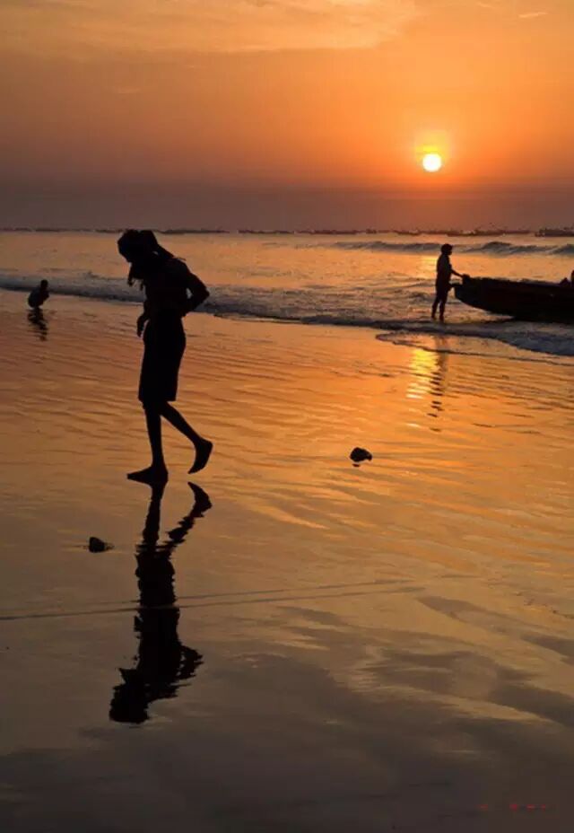 印度普里海滩拍摄的剪影照片,落日时分,一位渔民打渔归来,他的剪影和沙滩的倒影,在夕阳的映衬下充满了形式美感,这样的拍摄机会转瞬即逝,摄影师当时用连拍的手法拍摄了多张照片,最后选出形态最美的一张。