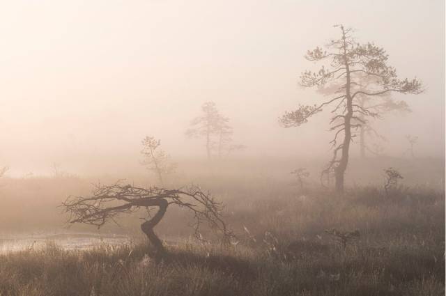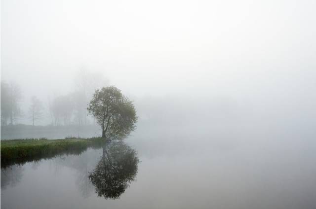 雾景是高调作品,以白色和淡灰为主。所以一定要有少些的、但有“重量”的黑色景物压住画面,否则,照片会因缺少力度而失败。