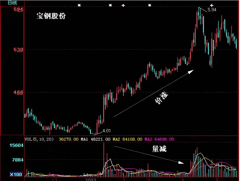 4、量减价升,继续持有:成交量减少,股价仍在继续上升,适宜继续持股,即使如果锁筹现象较好,也只能是小资金短线参与,因为股价已经有了相当的涨幅,接近上涨末期了。有时在上涨初期也会出现“量减价升”,则可能是昙花一现,但经过补量后仍有上行空间。