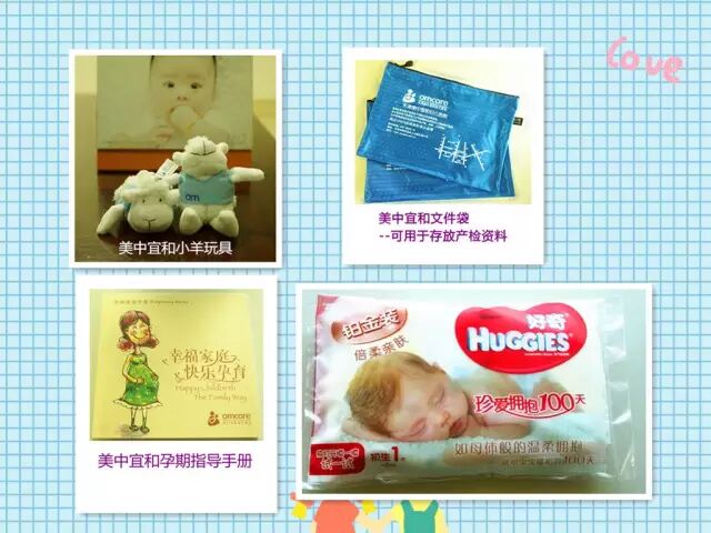 孕妇产检文件袋,孕期指导手册、纸尿裤试用装、美中宜和小羊,非常可爱哦~