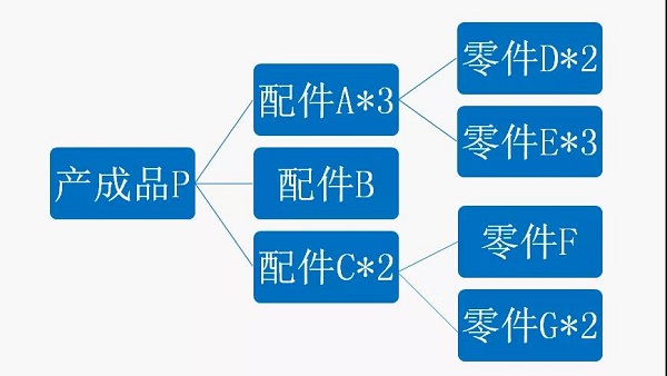 下图是一个3层的BOM结构,表示产成品P由3个配件A,1个配件B和2个配件C组成;配件A又由2个零件D和3个零件E组成;配件C又由1个零件F和2个零件G组成。