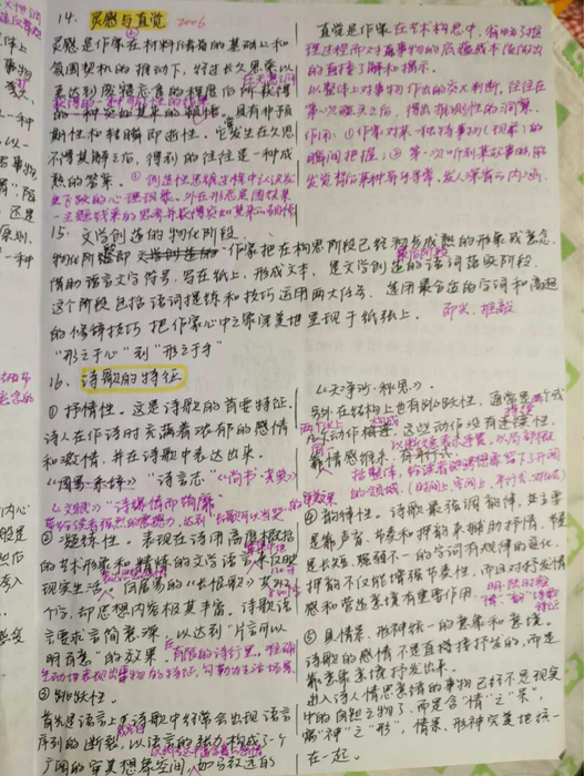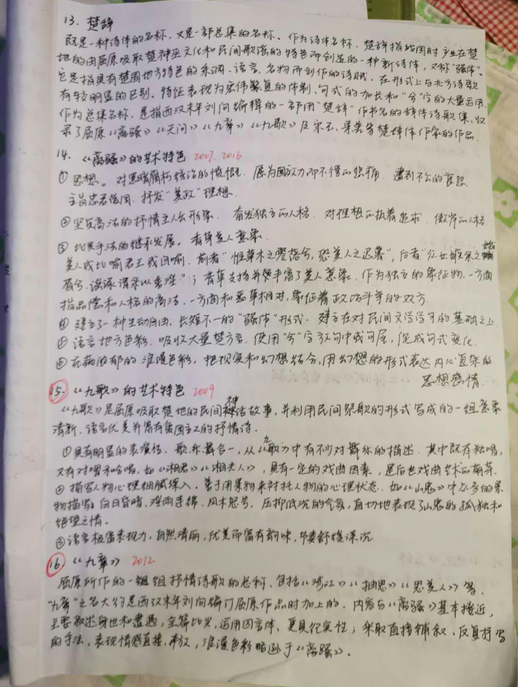 2. 文学基础:其实就是一个小综合,包括文学理论、中国古代文学史、中国现当代文学史和外国文学史。考题也是分为四个部分,考各自的知识,分值占比也不同。我前期就是看参考书,做笔记,这也是第一遍背书,背完之后基本没记住什么。然后我把真题按照年份写在一张纸上,整理出考频高的题目和知识点,然后根据真题完善笔记,之后我每天下午就开始背专业课笔记。