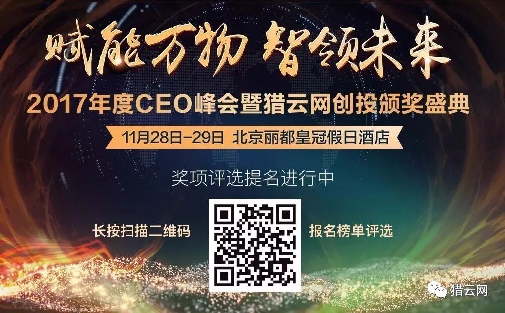 #《赋能万物 智领未来》2017年度CEO峰会暨猎云网创投颁奖盛典#将在11月28-29日于北京丽都皇冠假日酒店举行,近百位知名投资机构大咖、独角兽创始人、创业风云人物,以及近千位投资人及创业者与您相约。奖项评选已全面开启,欢迎创业公司以及投资机构填写资料申报奖项。长按上图二维码,报名参与榜单评选。
