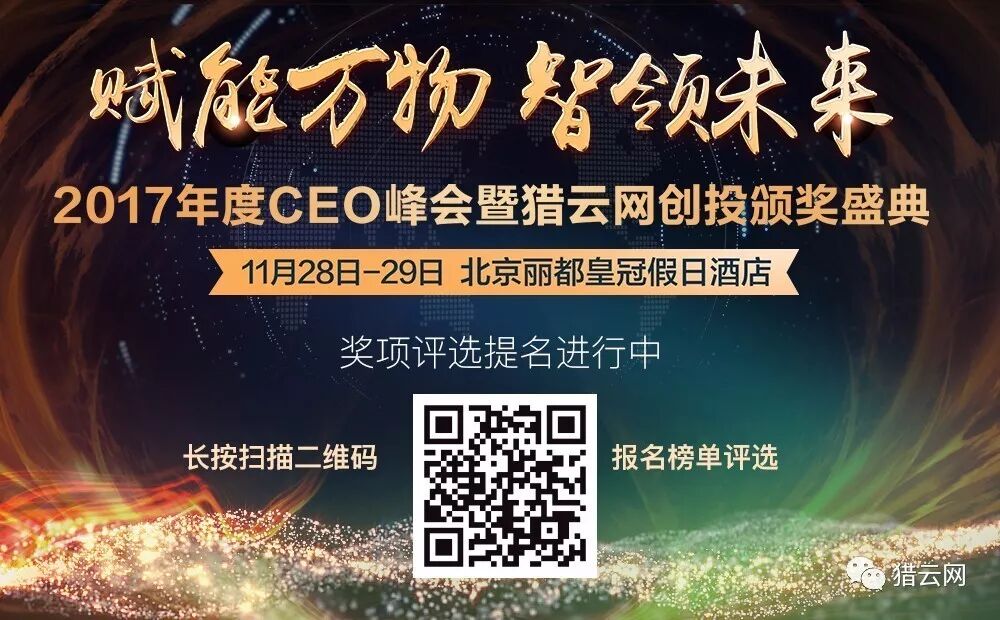 #《赋能万物 智领未来》2017年度CEO峰会暨猎云网创投颁奖盛典#将在11月28-29日于北京丽都皇冠假日酒店举行,近百位知名投资机构大咖、独角兽创始人、创业风云人物,以及近千位投资人及创业者与您相约。奖项评选已全面开启,欢迎创业公司以及投资机构填写资料申报奖项。长按上图二维码,报名参与榜单评选。