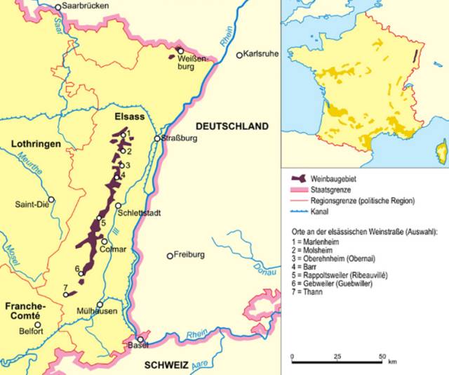 从地理位置来看,阿尔萨斯刚好位于德国与法国的边界,其左边是Vosges山脉,右边则是莱茵河平原(Rhine)。在二次世界大战结束之前,阿尔萨斯产区有很长一段时间处于德国的掌控之下,因此无论在酿酒技术上还是葡萄酒相关法令上,阿尔萨斯与德国都有类似的地方。例如: