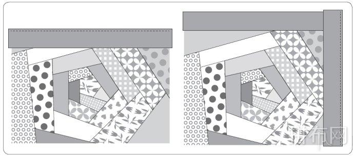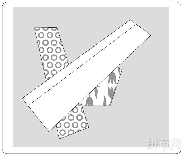 2.剪切一块长布条,正面向下,其一边与五边形的一条边对齐。选择1/4英寸直缝压脚、直线缝线迹,沿边缝纫直线。缝好后,翻开折平布片。