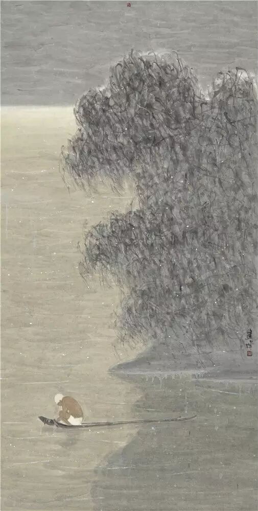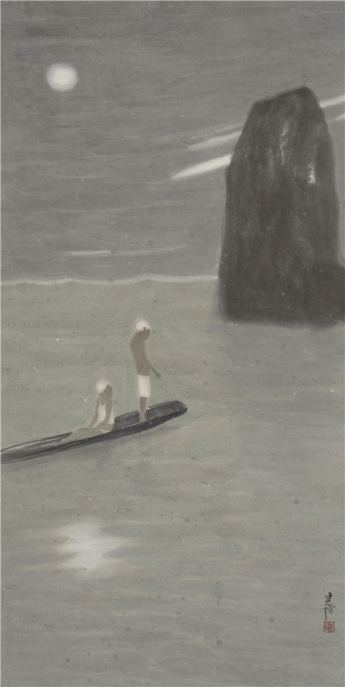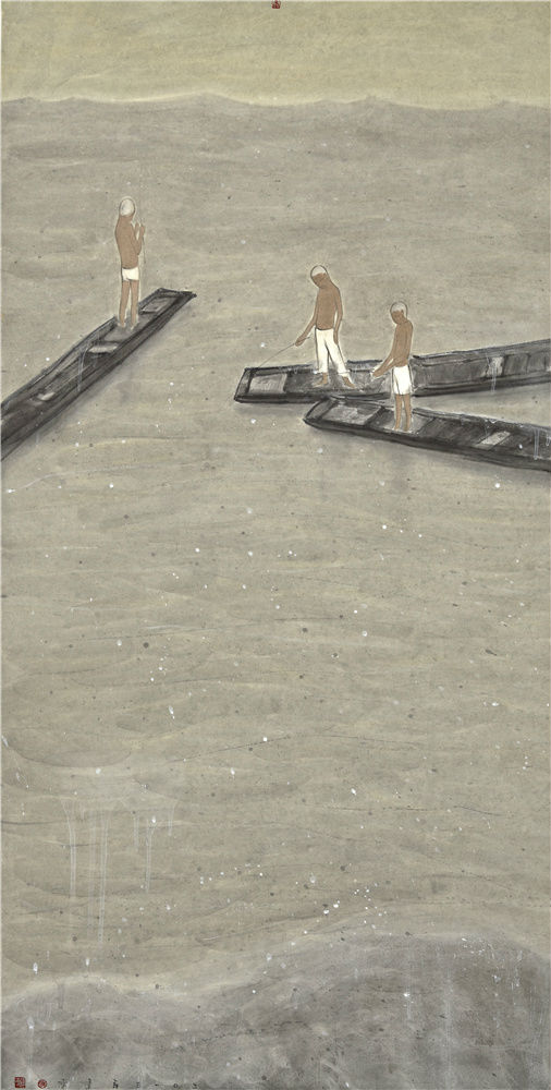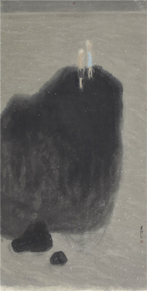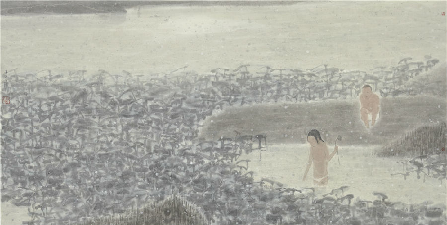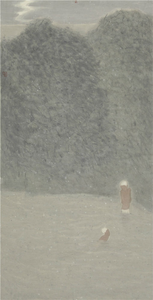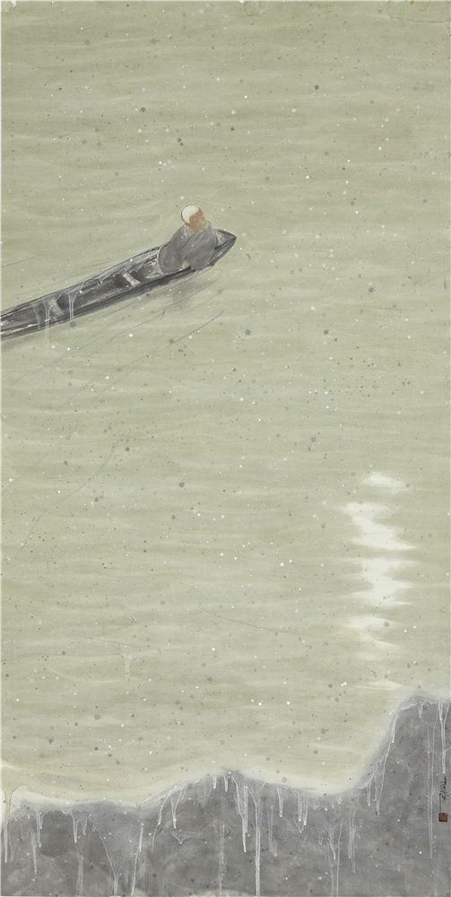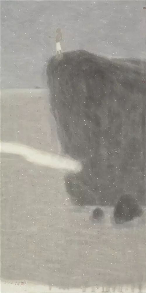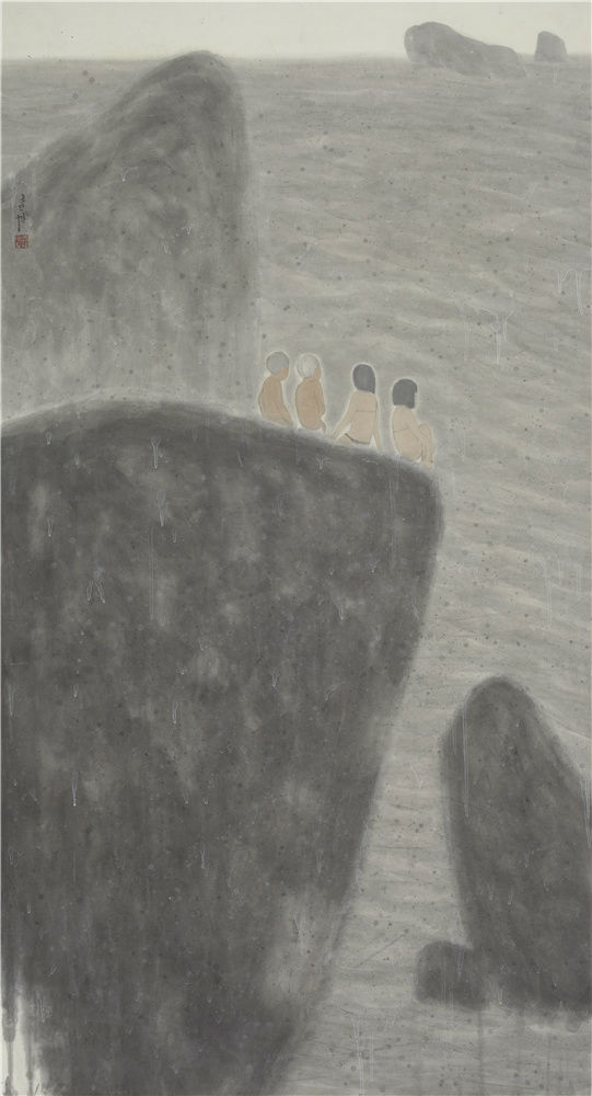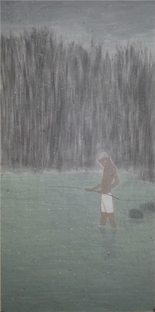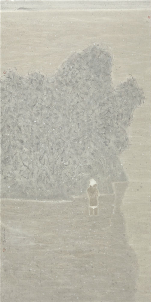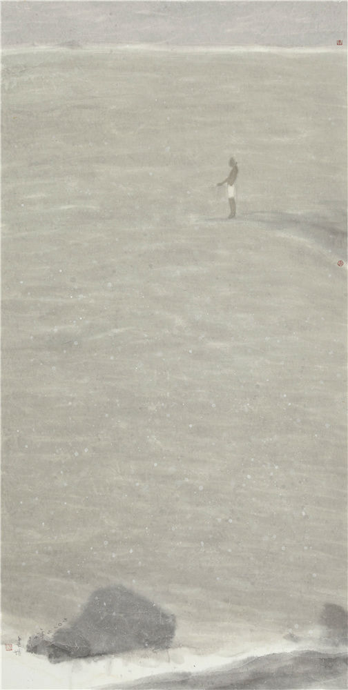 马建博的画作提示了延续百年的中国画变革的问题。曾经我们对于将山水画翻译成英文Landscape一词颇为踌躇,因为它对应着油画中的风景画,而在最深层的地方,风景画与山水画存在着巨大差异。在马建博的绘画中,我们似乎见到了类似的困难。他的画首先不能归于人物画,因为虽然大部分画面中有人物,但都不具备传统人物画“传神写照”的审美追求。另一方面,他的画也不属于山水,因为其画面也未追随“澄怀观道,卧以游之”的传统旨趣。相反,在精神气质上,马建博的画更接近Landscape一词翻成山水画的本意。在他的一些画作中,甚至可以看到十八世纪德国浪漫主义风景画家弗雷德里希的影子。这种弥漫在画面中的淡淡乡愁更多来源于生命个体对现代文明的敏感和困惑,而非传统绘画中田园诗般的审美精神的延续。与此相匹配,画家在笔墨语言上也采取了一些变化,但这不在这篇短文的讨论范围之内。由此我们可以看到,尽管在笔、墨、纸等绘画材料保持不变的情况下,中国画创作的深层变革。马建博的画面可以视作“中国画改良论”这一历史命题在当今语境下的一个小小注脚。