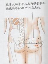 是在胆经的穴道,在臀部腰下头胯的枢纽上侧边,是一个满大的穴道,环跳穴上面的肌肉非常的肥厚,要用很长的针才能扎到穴位,有的时候甚至要用到六寸长的针。取穴的方法比较特殊:侧卧,底下的腿弯曲,上面的腿伸直。