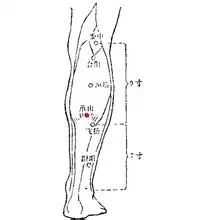 也是足太阳膀胱经的穴道,在现代医学称之为腓肠肌的下方,古人叫做腨,也就是小腿肚,这个地方长得像鱼的腹部,所以在马丹阳天星十二穴歌里头,就叫它“鱼腹”,它位于腨肠分肉间,