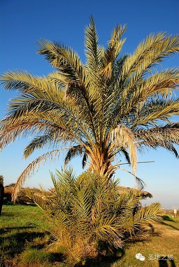 《圣经》中的棕树指棕榈科的海枣,又名枣椰、蜜枣,即指七大土产中的蜜。产于阿拉伯和北非的常绿大乔木,栽植历史长达5000年,也是以色列的重要经济作物。“羽状复叶丛生在茎端。浆果长椭圆形,形似枣子,可鲜食或作蜜饯……由茎浸出的液汁,可制砂糖或酿酒”(《辞海》海枣条)。它是圣经七大植物之一。经文中有多处描述:如摩西率以色列子民出埃及,到以琳安营,那里有十二股清泉和七十株棕树(象征以色列十二支族、七十长老)(出15:27);又如以色列人渡约旦河攻占的迦南重镇耶利哥,多海枣,称棕树城(申34:3)。海枣还是以色列节庆与和平的标记,如住棚节子民折棕树枝、柳枝敬拜上帝(利23:40)。《新约》记载,耶稣骑驴入圣城,百姓手持棕树枝向“以色列的王”欢呼(约12:13)。