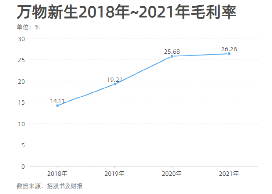 近三年,万物新生营收一直保持双位数增长,2021年增速更是超过60%,而另一面其毛利率也在不断攀升,从2018年的14.11%暴涨至2020年的25.68%,并于2021年进一步提升至26.28%。