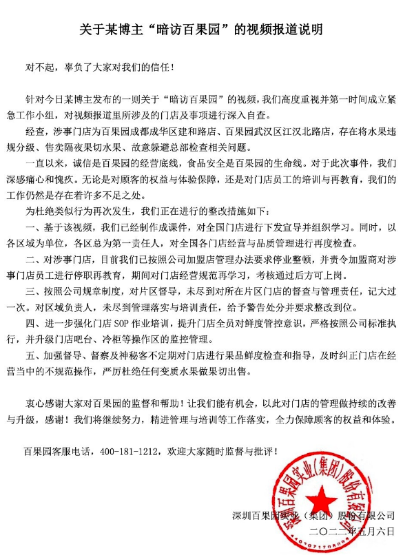 5月6日,某博主发布视频表示,在暗访了全国拥有5000家门店的水果连锁品牌——百果园后,发现涉事门店,把变质水果做成果切,发霉的苹果也不理不问,继续售卖,对于总部禁止销售隔夜水果的要求也熟视无睹,同时还存在小凤梨当大凤梨售卖的情况。