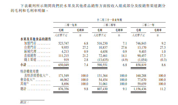 事实上,百果园加盟商的盈利空间也因为百果园提价而变得越发狭窄,2019年、2020年,百果园向加盟门店销售水果及其他食品的毛利率维持稳定,分别为6.8%及7.1%,但2021年则上升至9.2%,主要由于“我们考虑到我们加盟网络的成熟度及因COVID-19疫情逐渐受控而趋于稳定的市场环境,我们提高对加盟商的售价。”