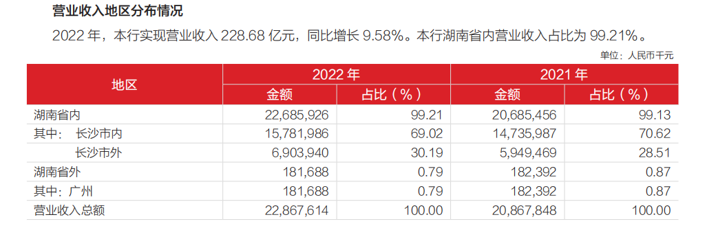 2022年,长沙银行在湖南省内的营收占比进一步提高至99.21%,广州是其唯一在湖南省外有分行的城市,在发展战略中,长沙银行的方向之一是"以明晰的定位、配套的机制和强有力的支持,全力推动广州市场做精做透,推动广州成为新战略增长极。"