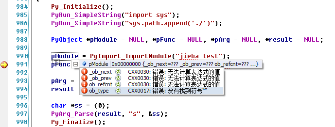 如果程序在PyRun_SimpleString(“sys.path.append(‘./’)”);之前改变了工作路径,而改变之后的工作路径下没有你想要加载的模块,那么就会出现上图的错误,返回一个NULL,提示“没有找到符号”。