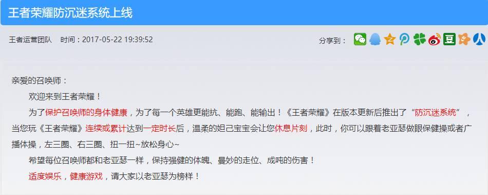 腾讯先知先觉,看到了来自上方的压力,早在5月22日的时候,就发布公告称,王者荣耀防沉迷系统上线。