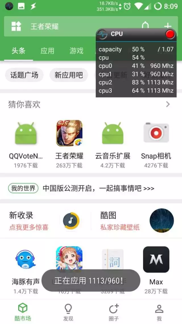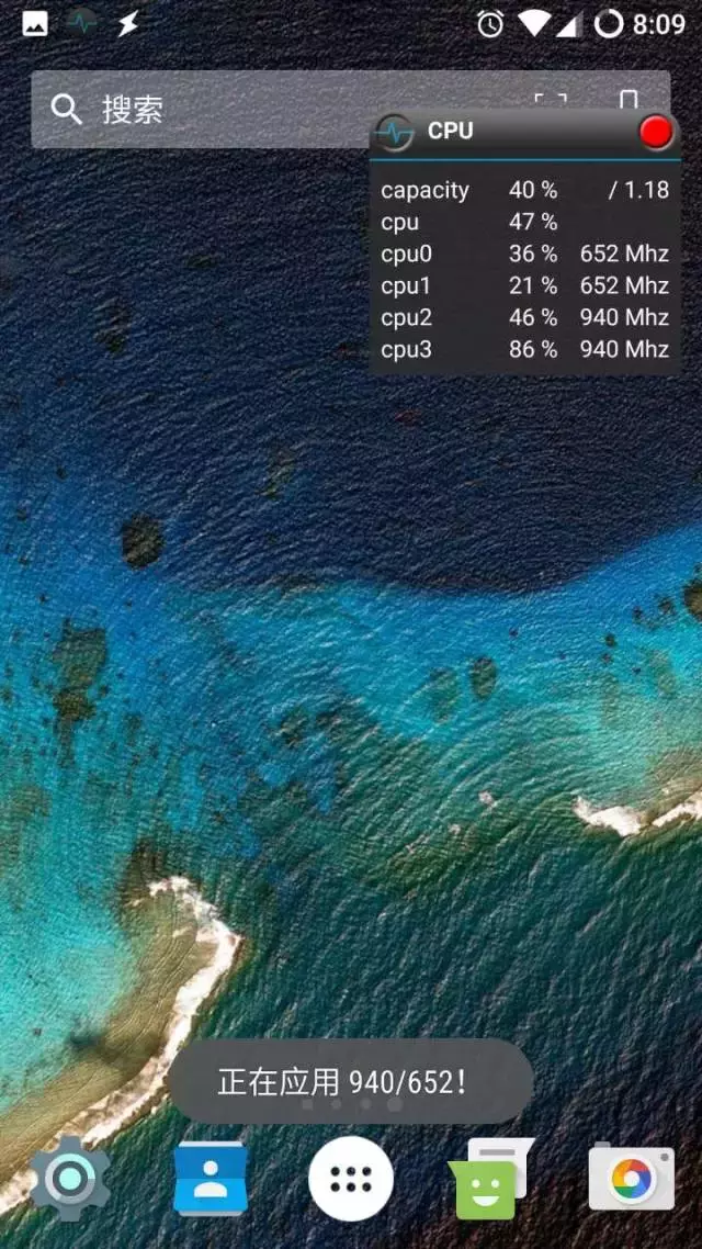 当酷安开启时,CPU频率调成大核1113,小核960;当酷安退出或者到后台的时候,大核变成940,小核变成652