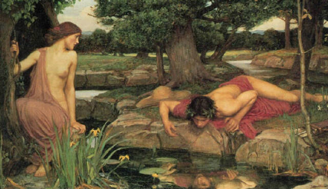 自恋这个名词来自希腊神话。那喀索斯是一名俊美的青年,他拒绝了女神厄科的求爱,爱上他自己在湖中的倒影